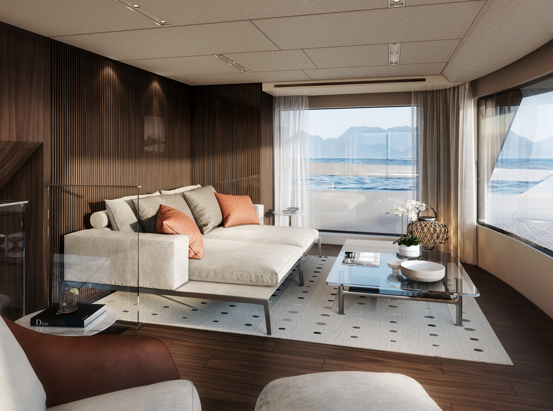 Interiors are conceived as fluid living spaces, where generous volumes, panoramic views and meticulously selected materials create a sanctuary of comfort and modern refinement, elegantly connecting interior and exterior life at sea.