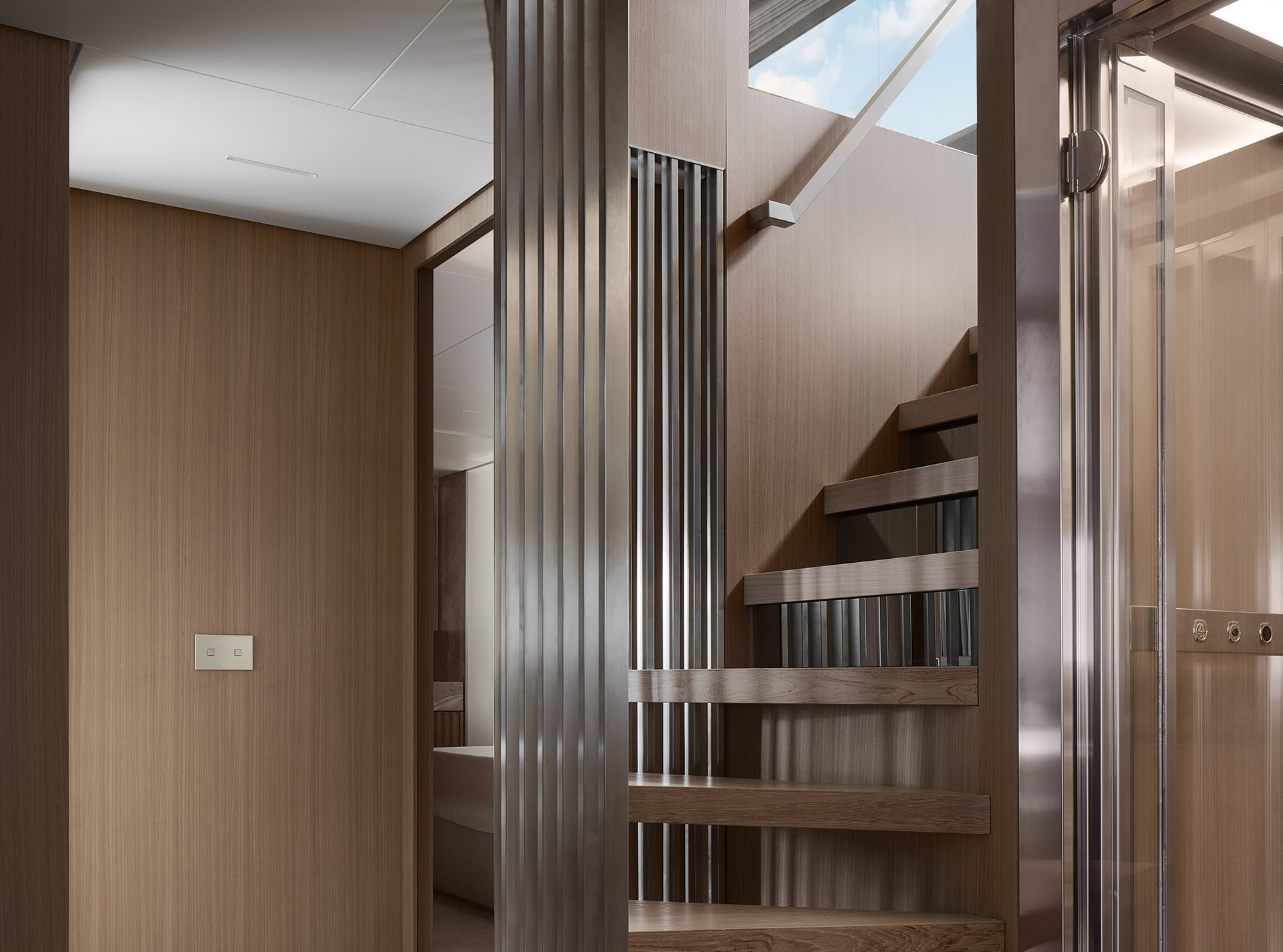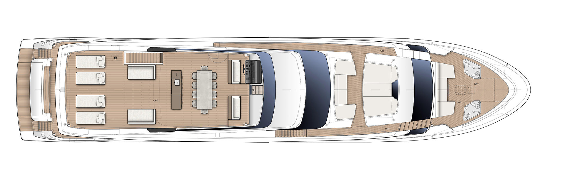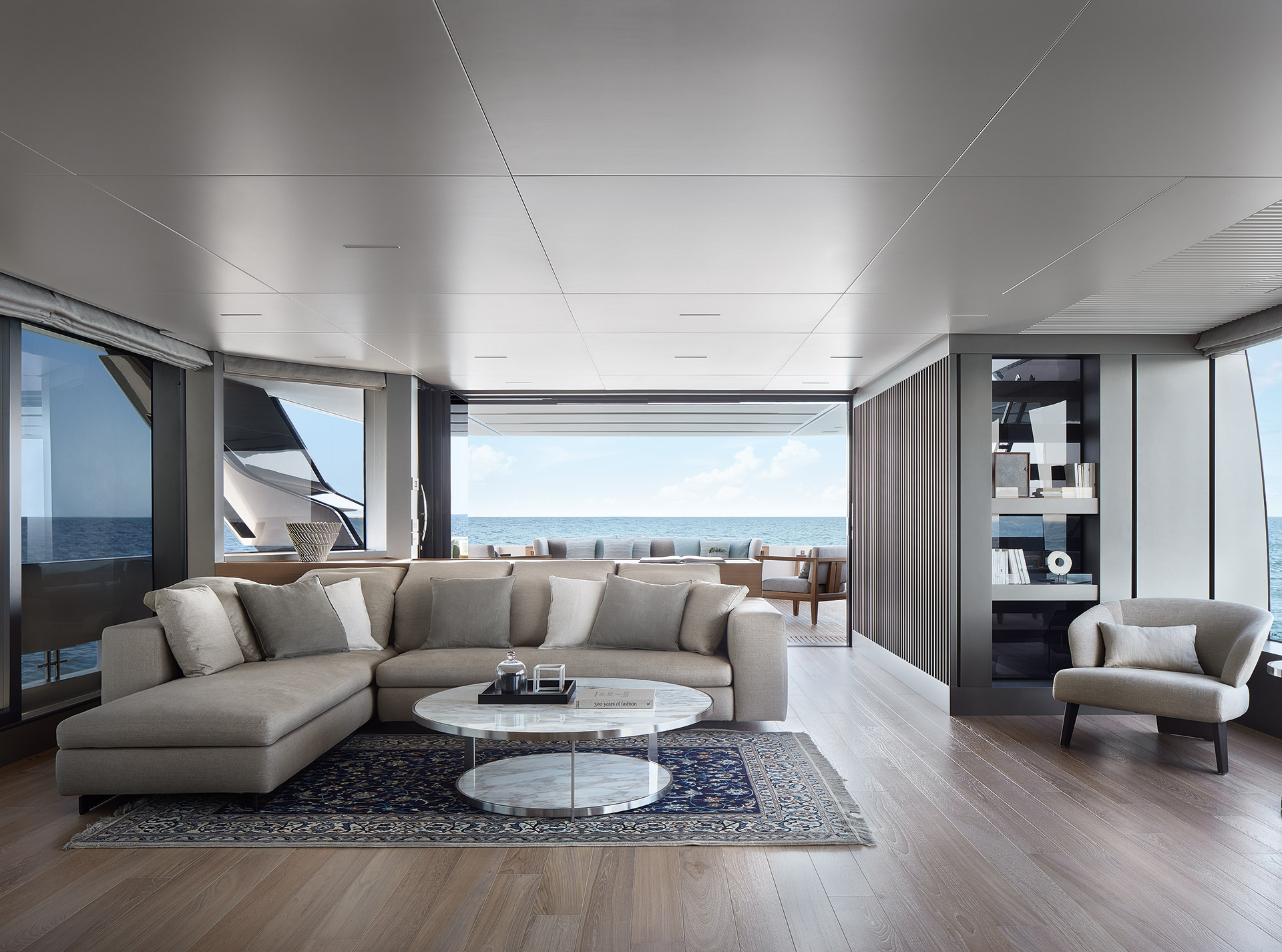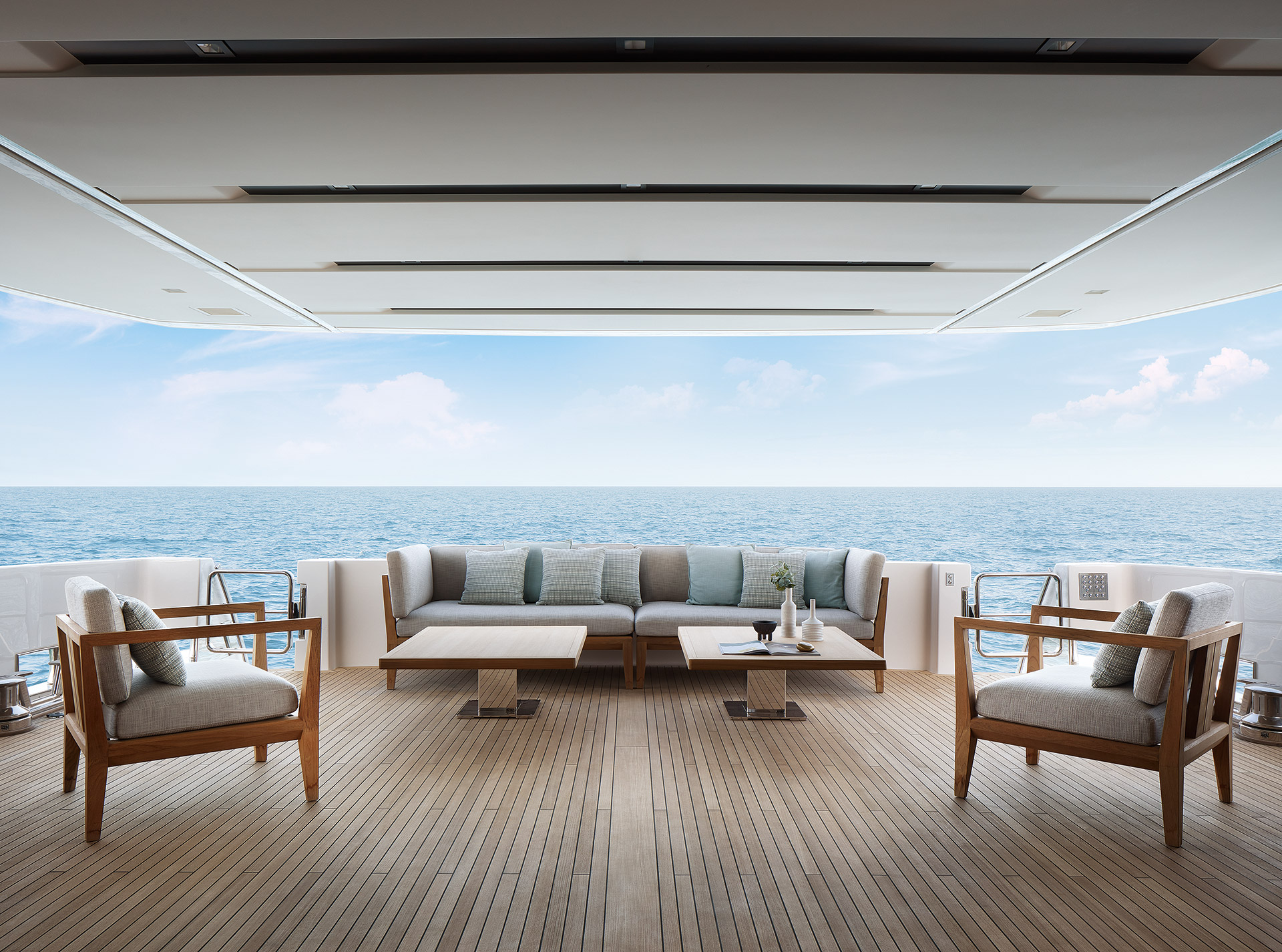 The SL120A exterior elevates asymmetry to its fullest expression, dissolving boundaries between inside and out. Sliding glass, lowered bulwarks and sculpted volumes create fluid circulation, panoramic sea views and expansive outdoor living.