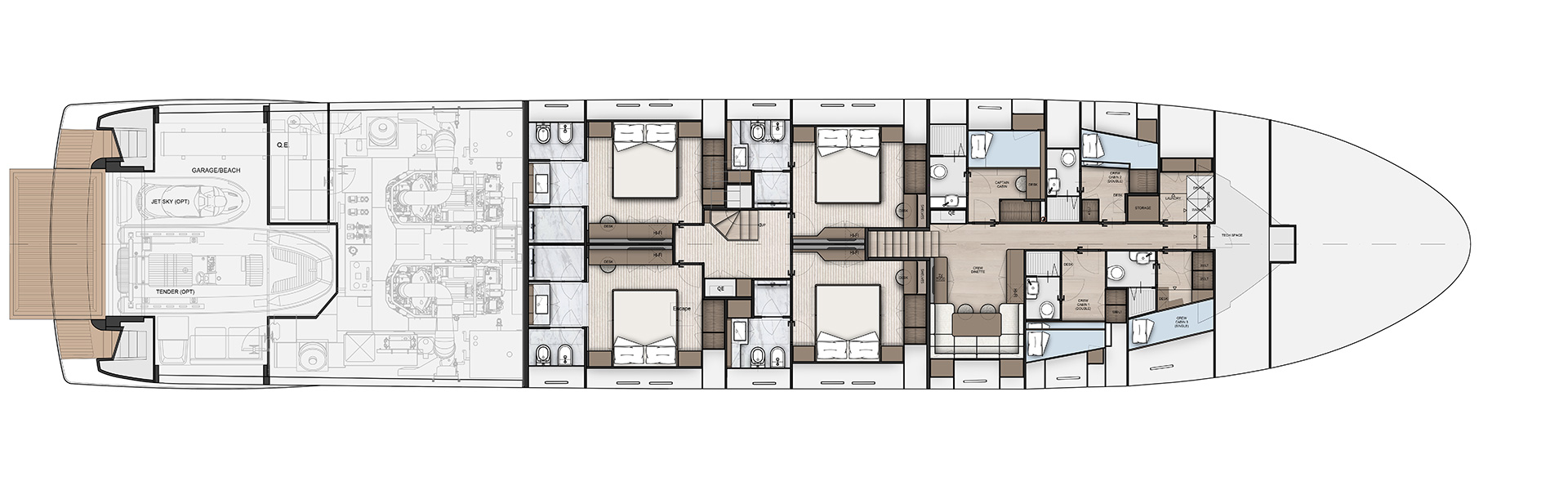 The interiors embrace lightness and harmony, with a full-beam owner’s suite and flexible living spaces. Neutral tones, walnut finishes and refined detailing create a calm, marine atmosphere of understated elegance.