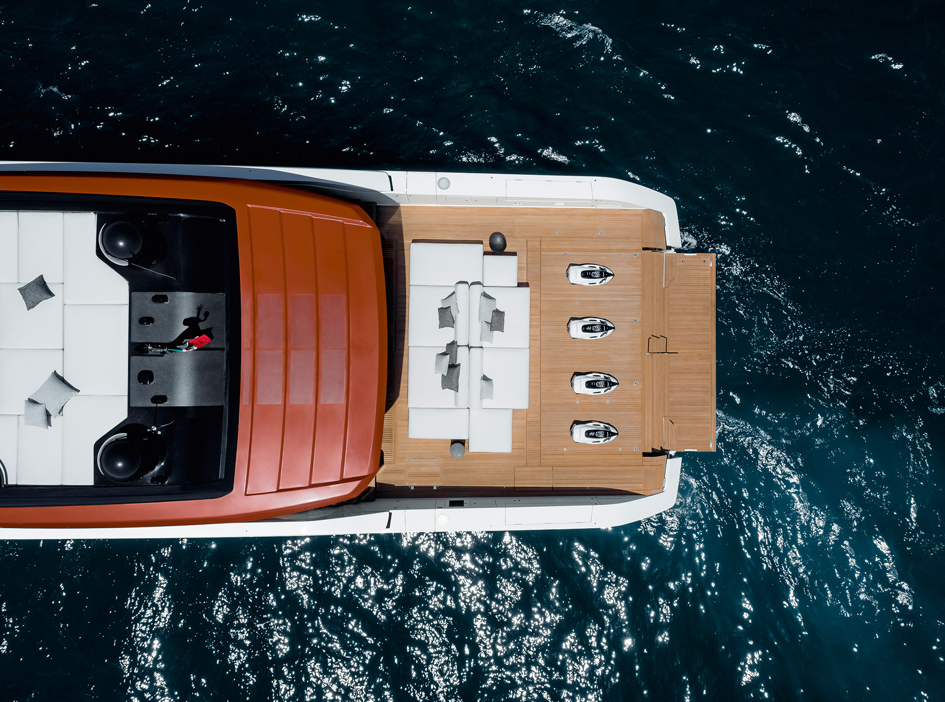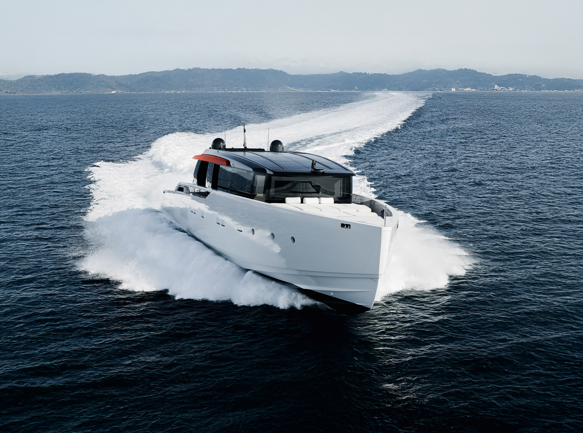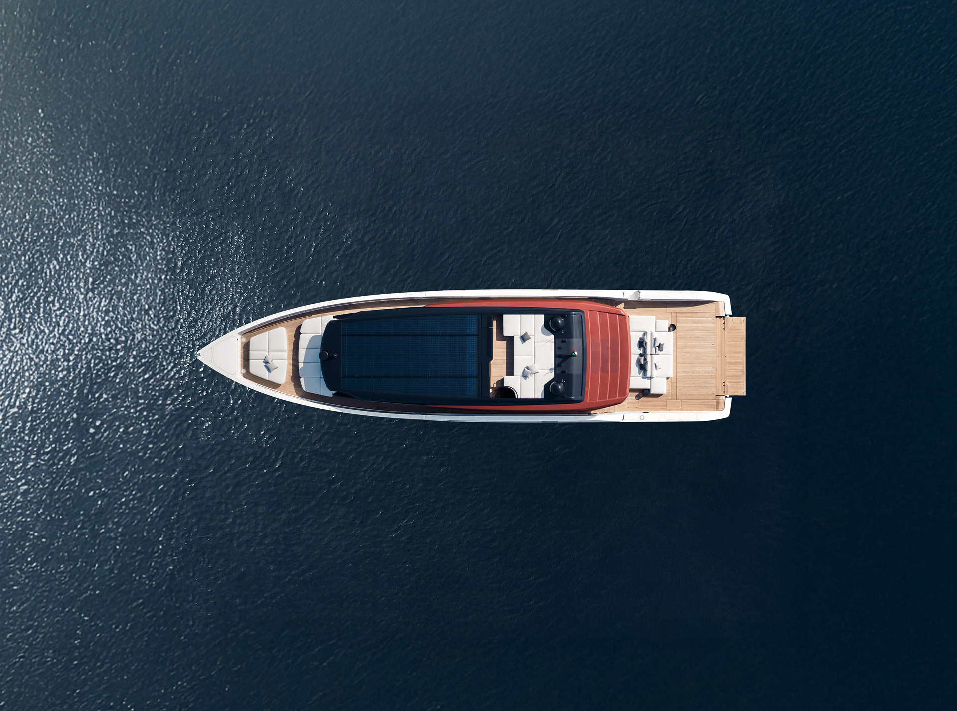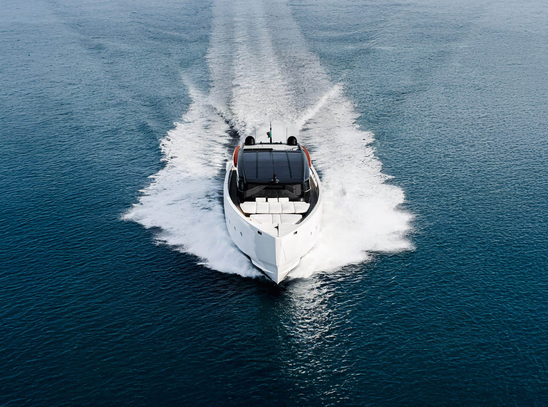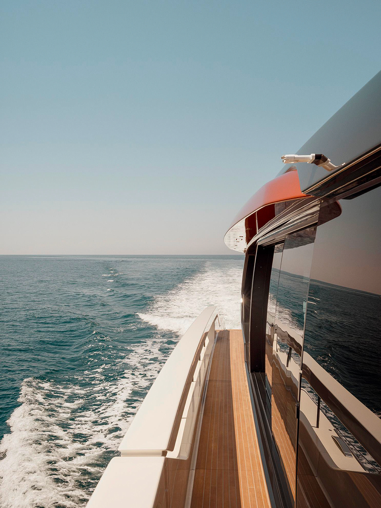 An advanced Smart Performance platform combines a lightweight hull, hydrojet propulsion and a three-engine system for efficiency and speed. Energy recovery, solar panels and batteries reduce consumption while enhancing onboard autonomy.