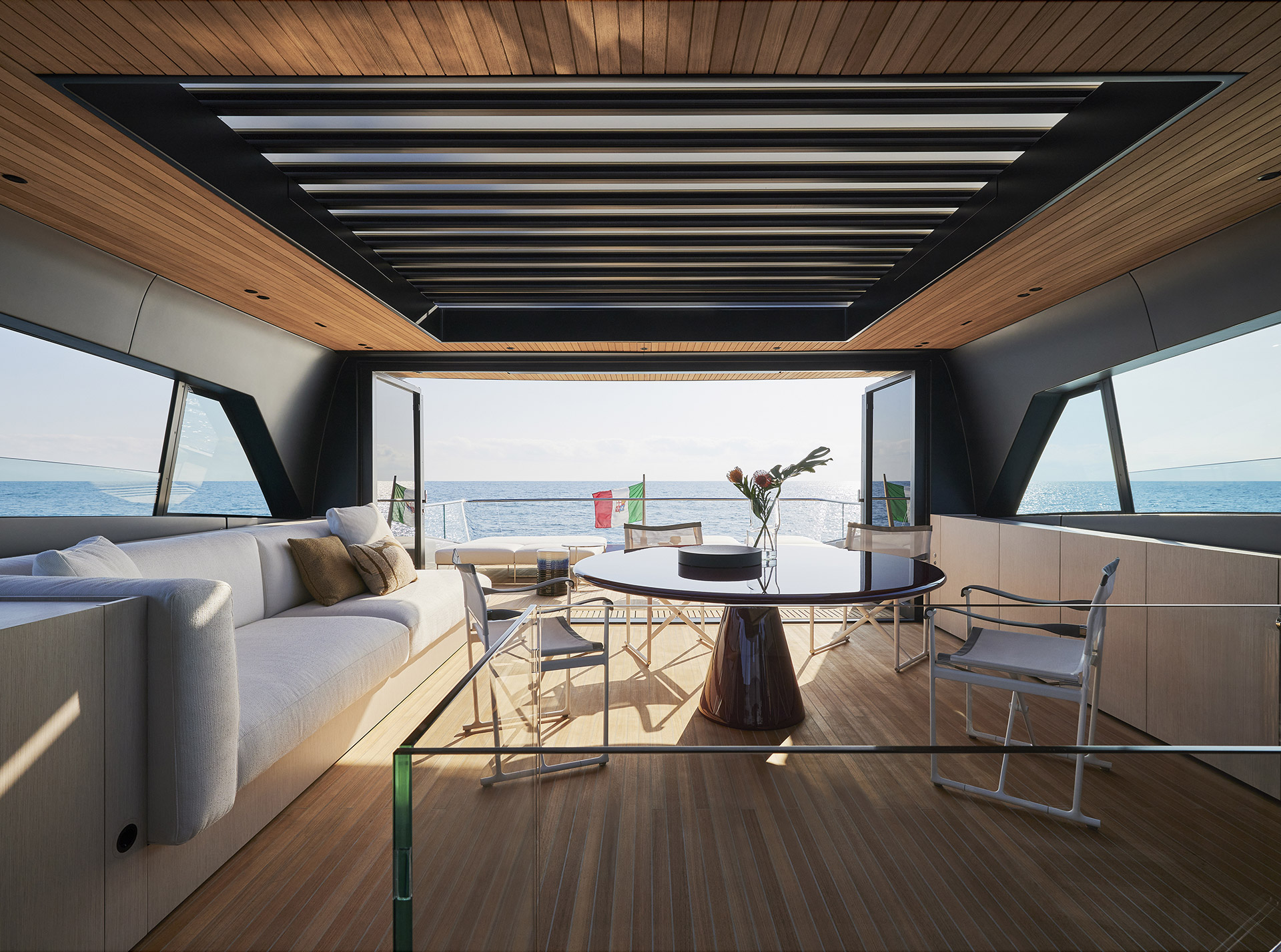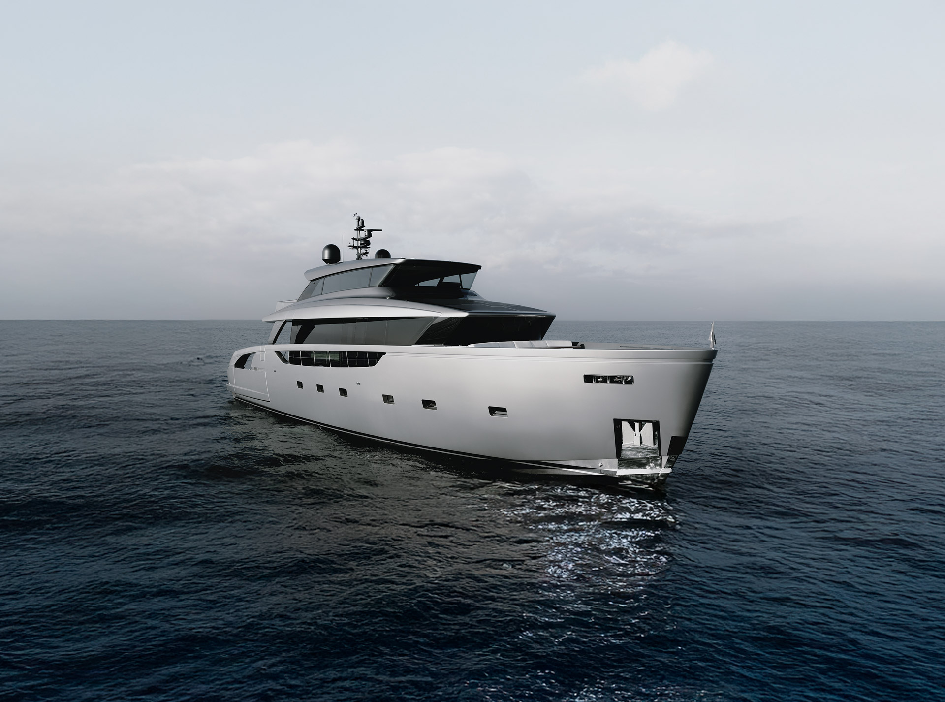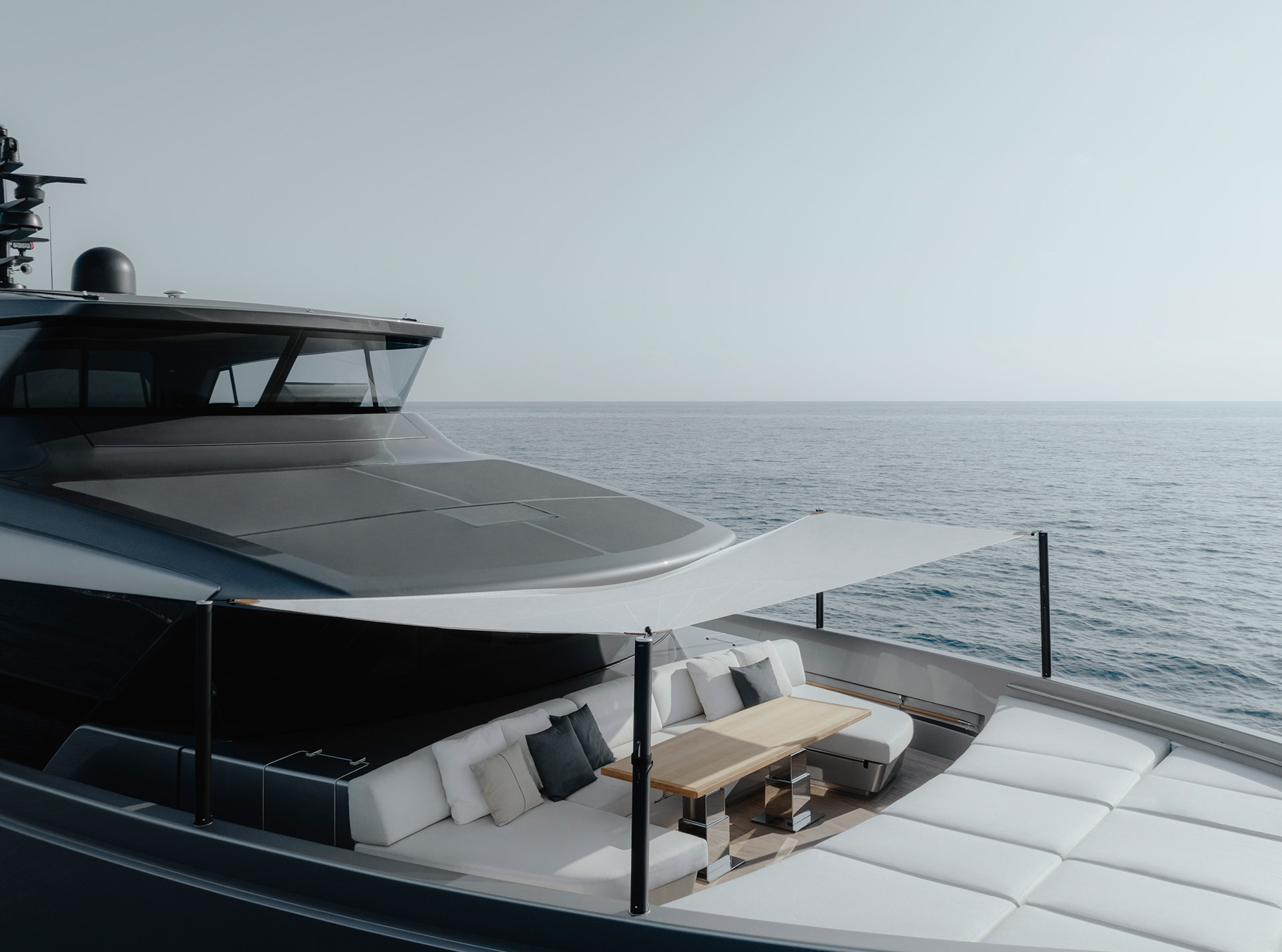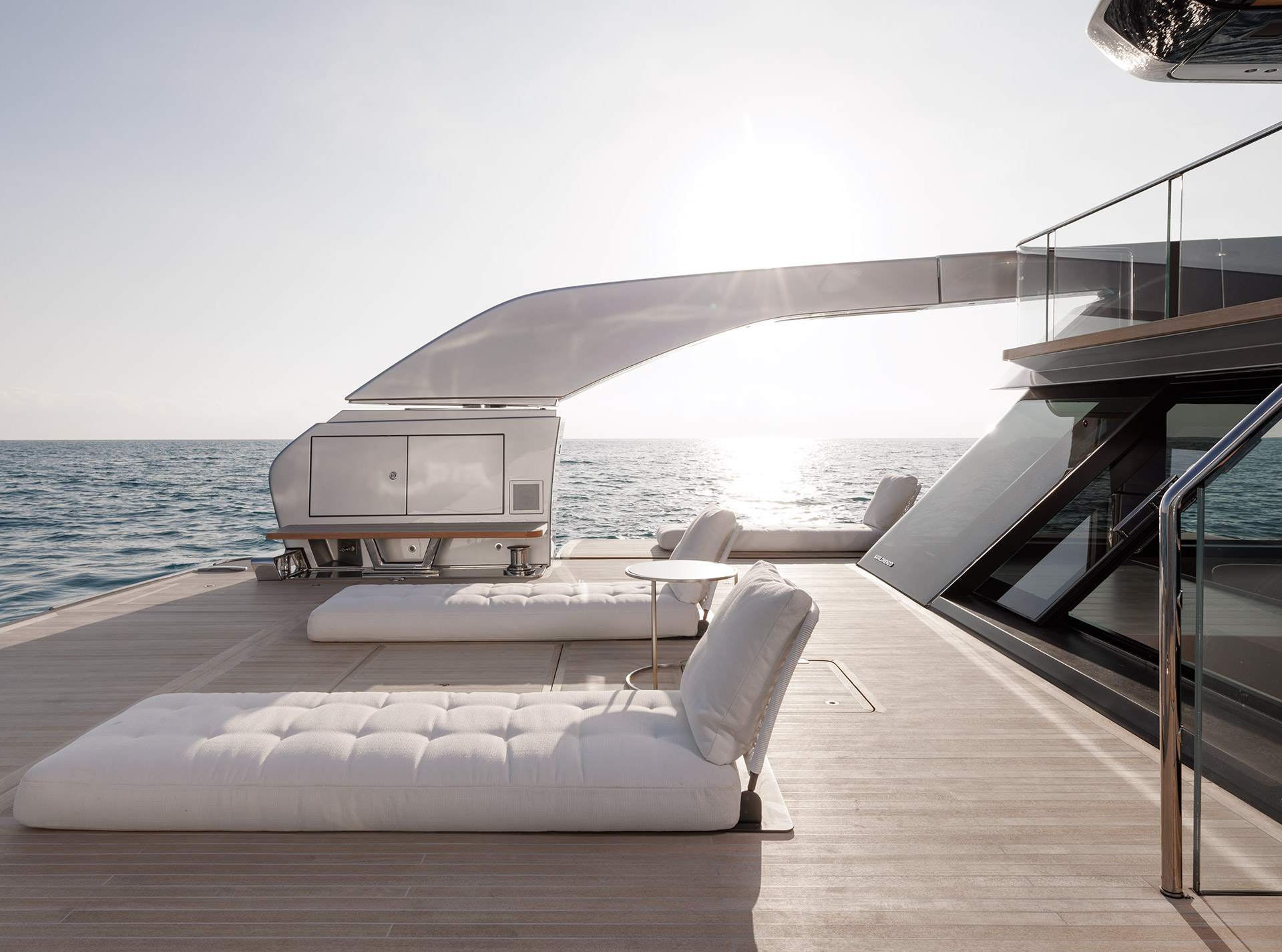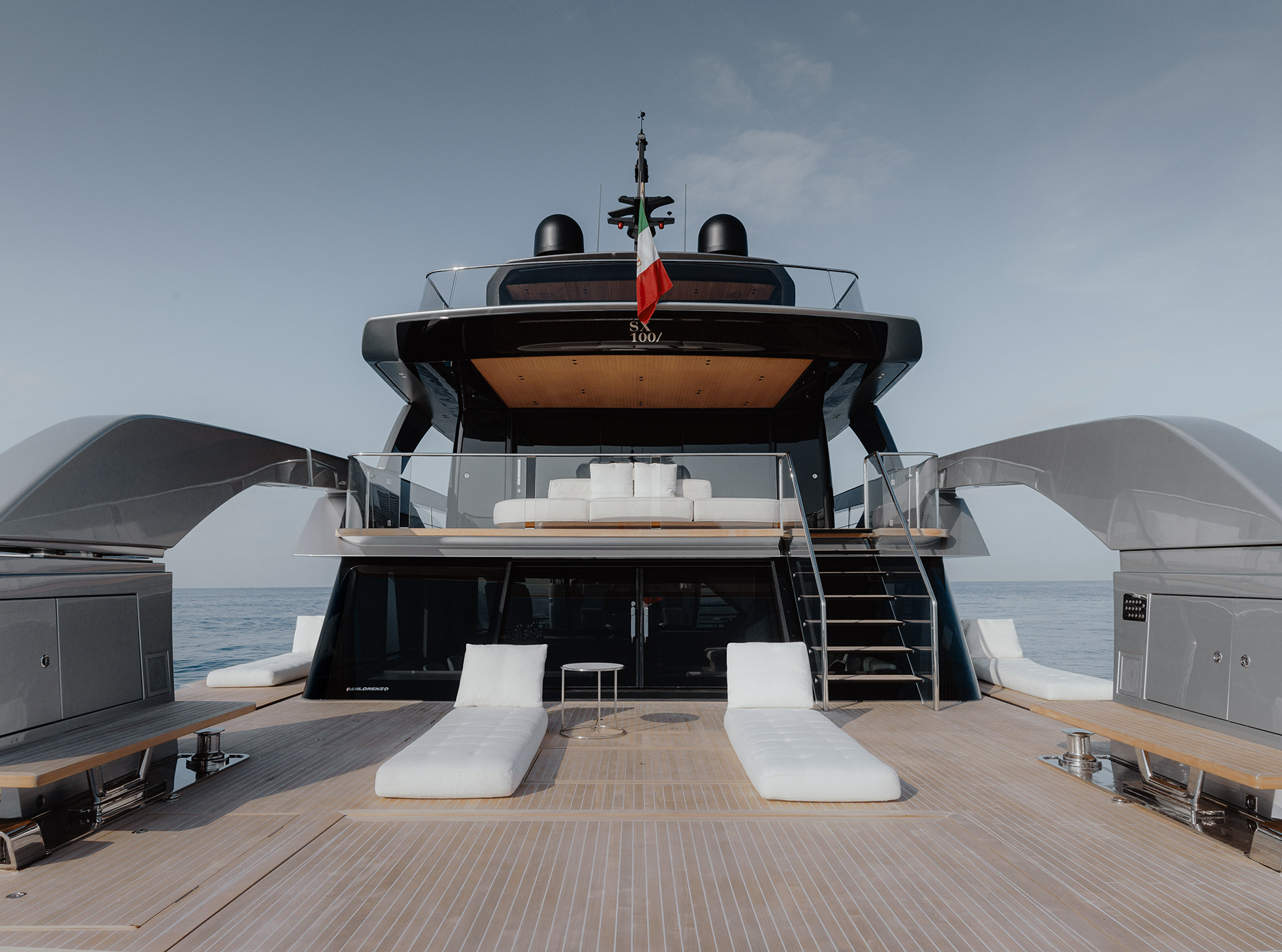 The SX100 exterior blends clean, architectural lines with fluid volumes, opening generously to the sea. Terraced decks, opening side platforms and a sculpted stern create a seamless dialogue between yacht and water.