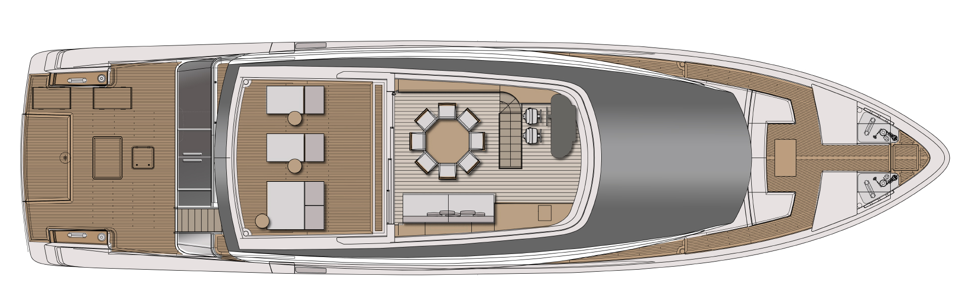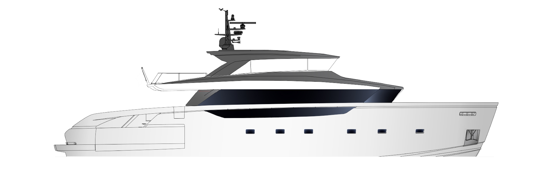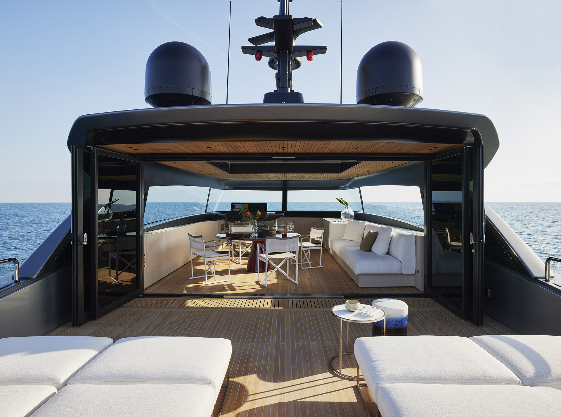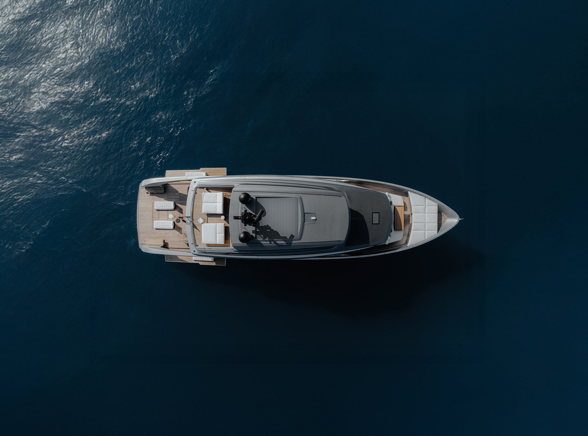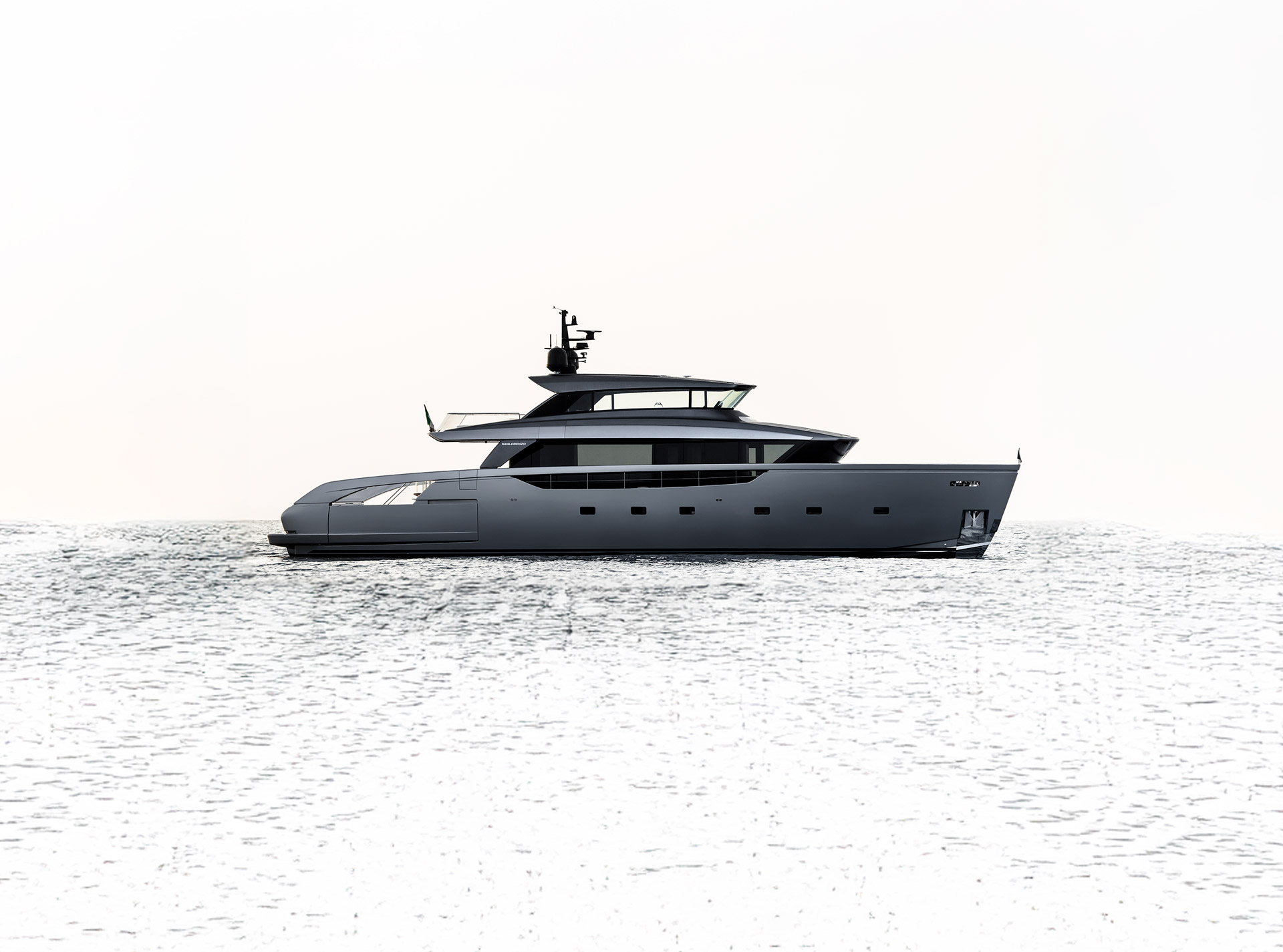 The SX100 exterior blends clean, architectural lines with fluid volumes, opening generously to the sea. Terraced decks, opening side platforms and a sculpted stern create a seamless dialogue between yacht and water.
